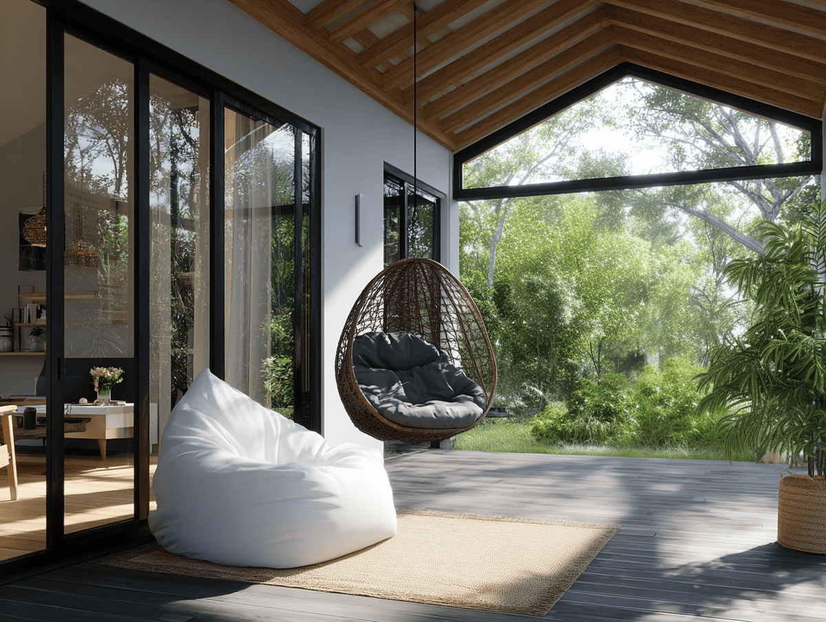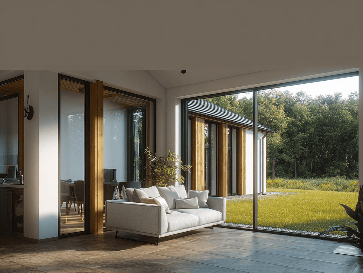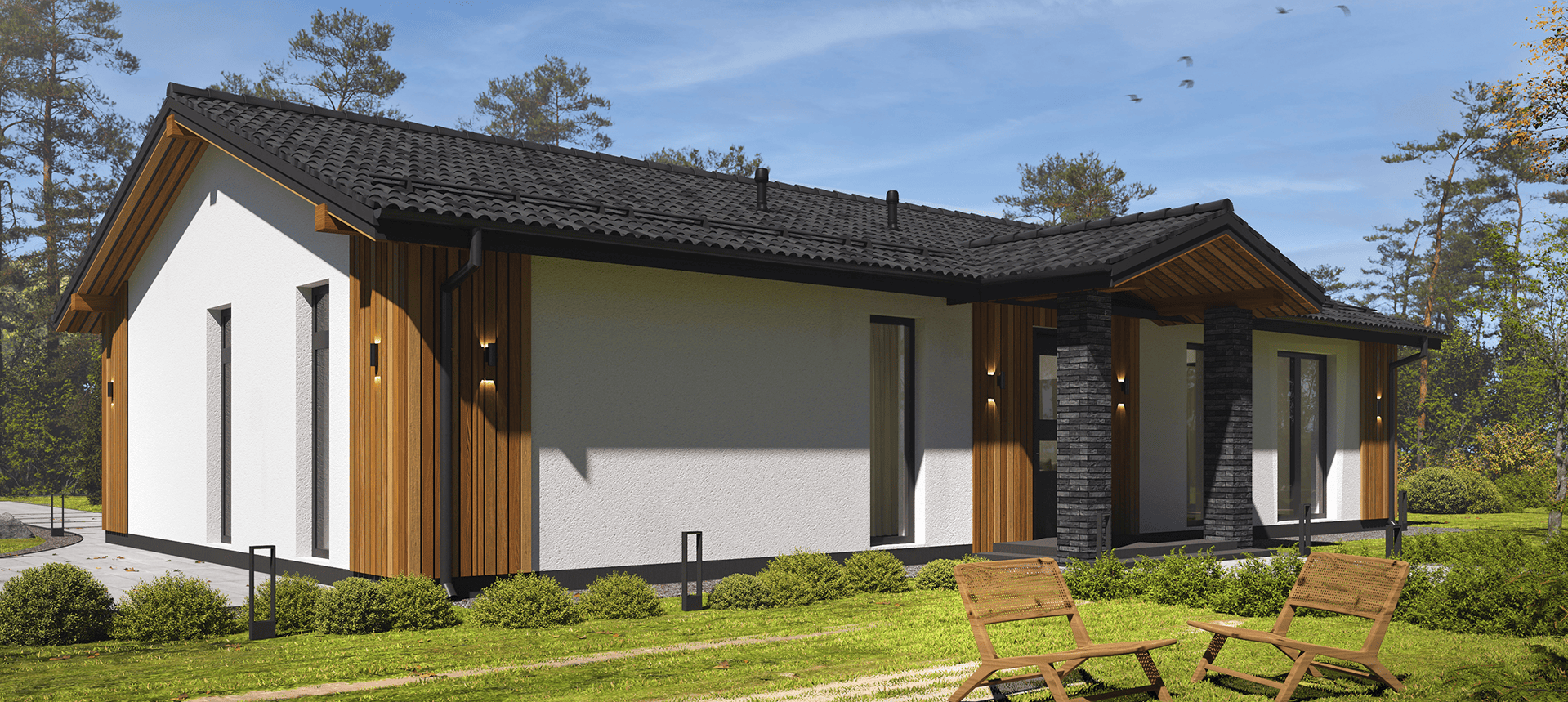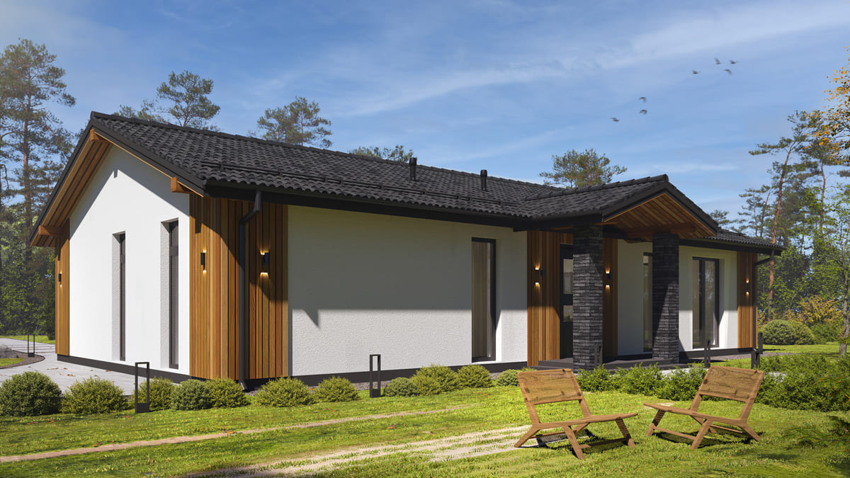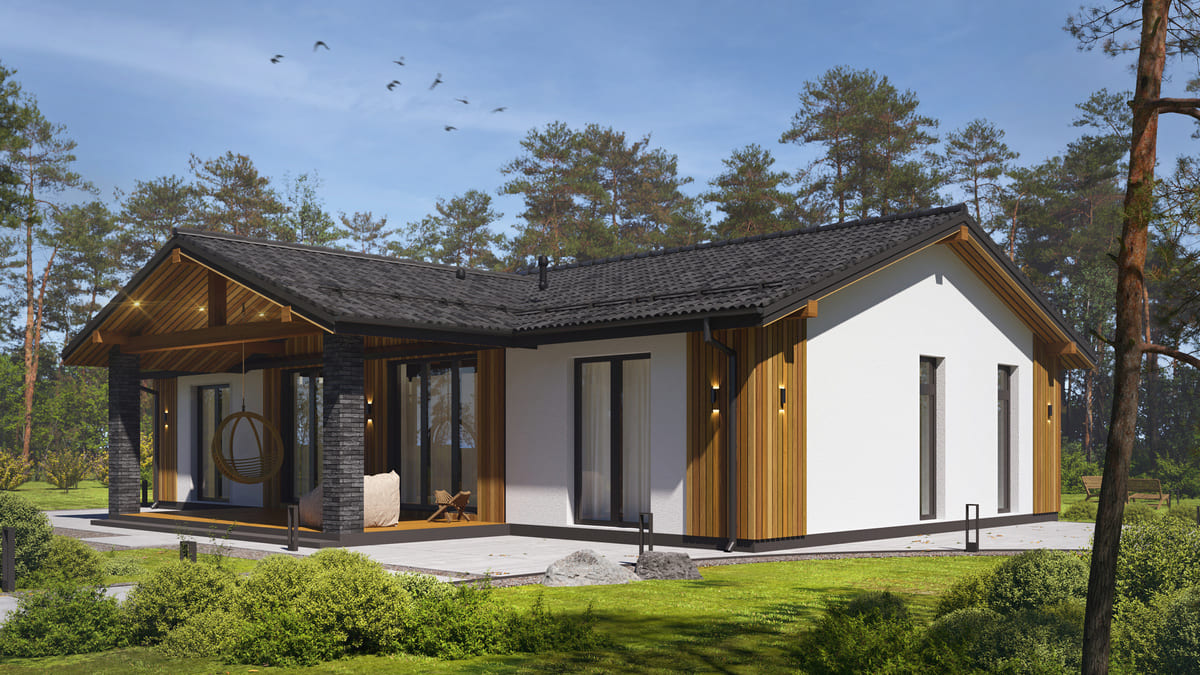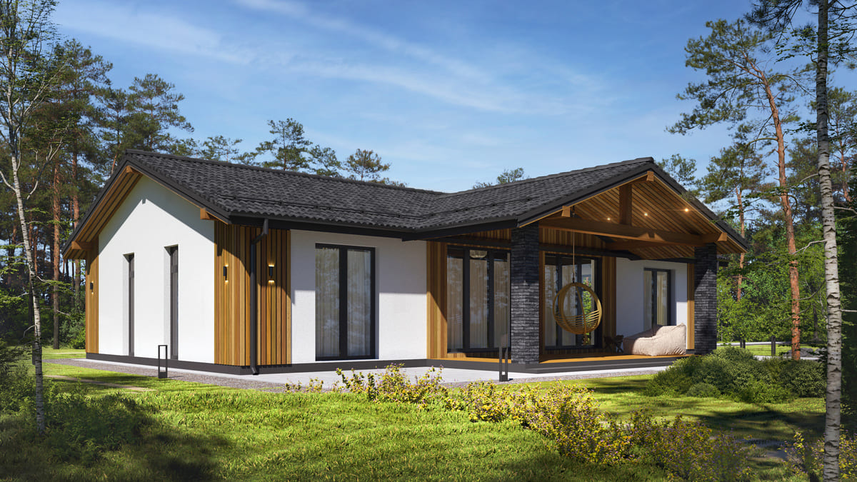 Дом «Фридом» — яркое воплощение этой философии. Ключевыми чертами его облика являются высокие потолки, эффектные панорамные окна в пол и крытая терраса, которая становится естественным продолжением гостиной. Фасад объединяет дерево, камень и светлую штукатурку. Гармоничное сочетание образует современный вид и отражает тесную связь с природой.