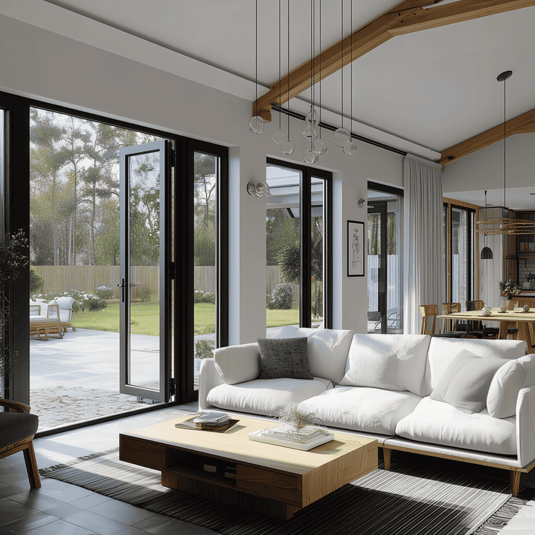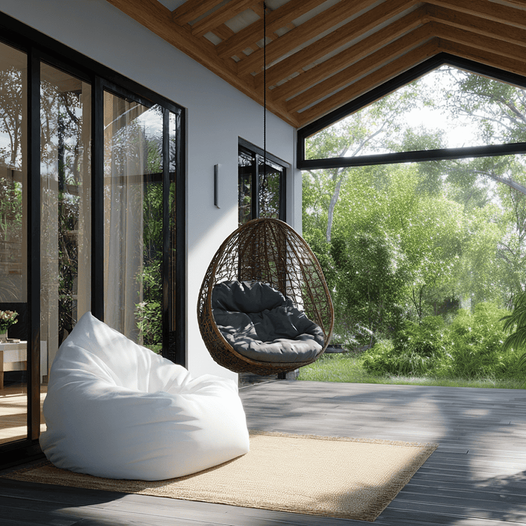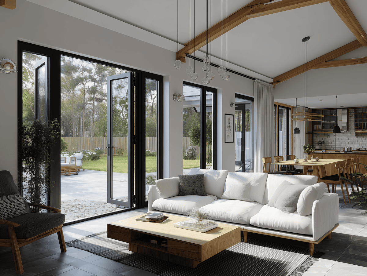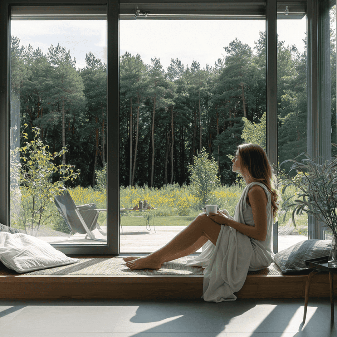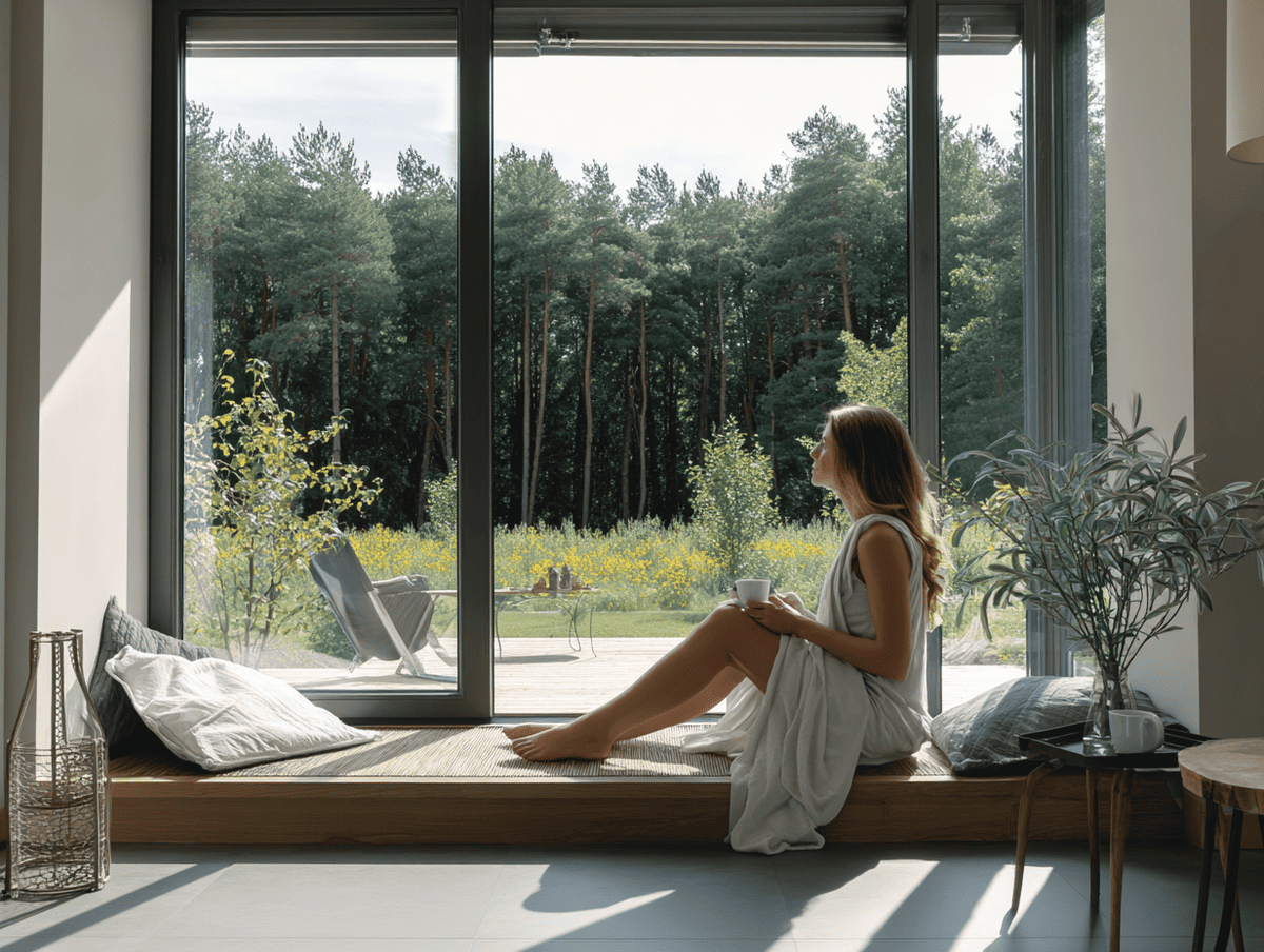 Дом «Фридом» — яркое воплощение этой философии. Ключевыми чертами его облика являются высокие потолки, эффектные панорамные окна в пол и крытая терраса, которая становится естественным продолжением гостиной. Фасад объединяет дерево, камень и светлую штукатурку. Гармоничное сочетание образует современный вид и отражает тесную связь с природой.